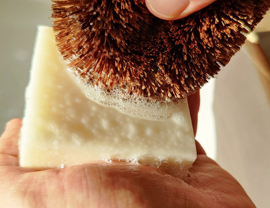 Wrijf met een natte afwasborstel of spons over het blok totdat je schuim creëert. Was je vaat zoals je gewend bent en spoel goed af. Laat het blok na gebruik drogen op een zeeprekje of loofah-pad voor een langere levensduur.